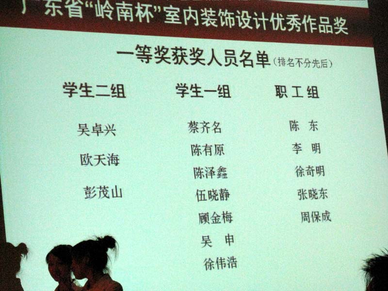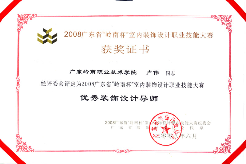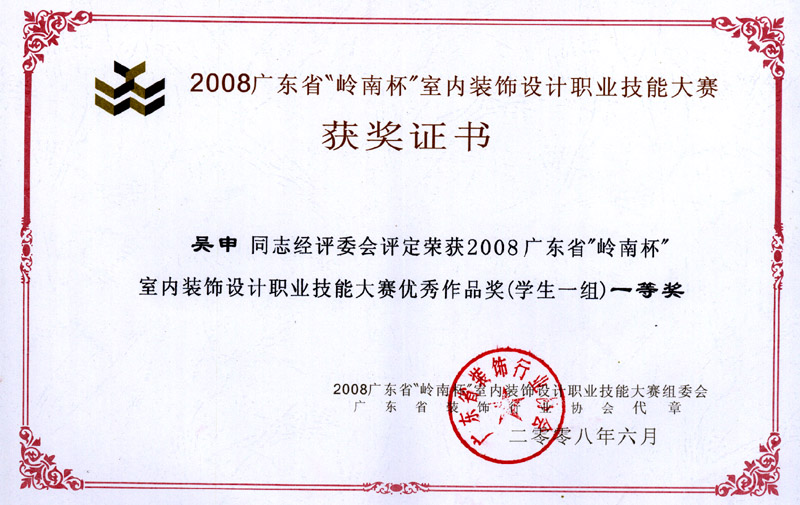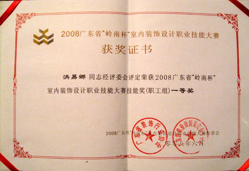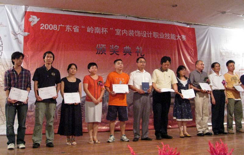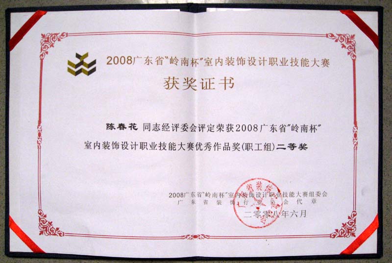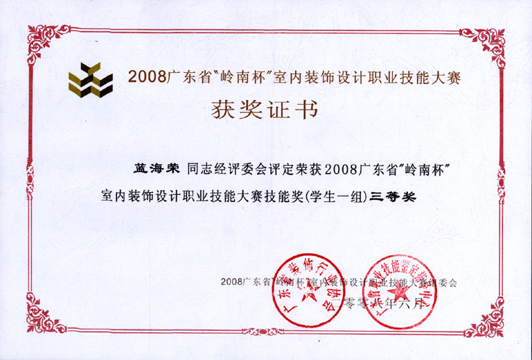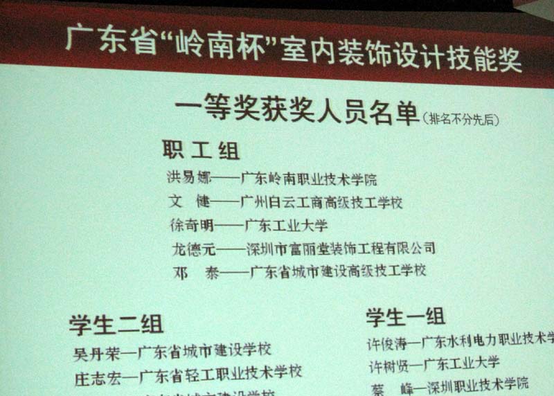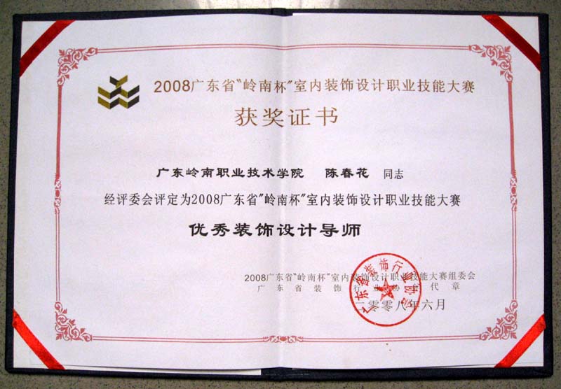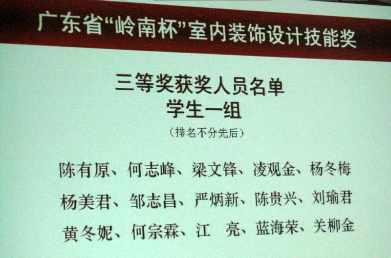 附:艺术设计学院艺术设计专业学生和教师奖项名单 学生组: ■三等奖1人:蓝海荣 组织奖: ■广东岭南职业技术学院获广东省优秀装饰设计教育院校奖 优秀装饰设计导师奖2人: ■陈春花、卢伟(广东岭南职业技术学院) 优秀作品奖: 职工组 ■二等奖1人:陈春花 ■三等奖1人:范疏强 职工组(获国家职业资格二级) ■室内装饰设计技师(4人):洪易娜/陈春花/卢伟/范疏强 学生组(获国家职业资格三级) ■室内装饰设计员:26人 |