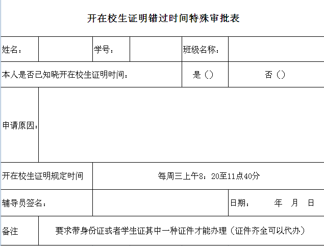 3、其他时间办理在校生证明说明:下载如下▼《开在校生证明错过时间特殊审批表》并如实填写-->辅导员审核签字--> 图书馆楼八楼教务处804室。