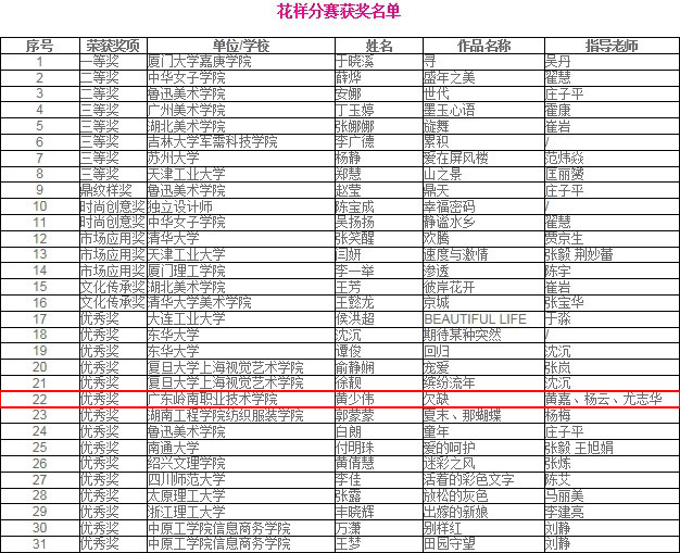 2011中国国际面料设计大赛获奖名单现已公布,我院2010级服装班学生黄少伟,在此次国家级的比赛中获得了优秀奖!