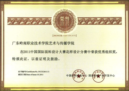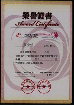 热烈祝贺我院10级黄少伟同学在国际面料设计大赛中 获得国家级优秀奖 2011中国国际面料设计大赛获奖名单现已公布,我院2010级服装班学生黄少伟,在此次国家级的比赛中获得了优秀奖! 此次大赛,在我院领导与老师的大力支持下,积极组织参与,获得了主委会颁予的团队优秀组织奖!