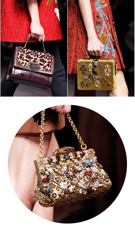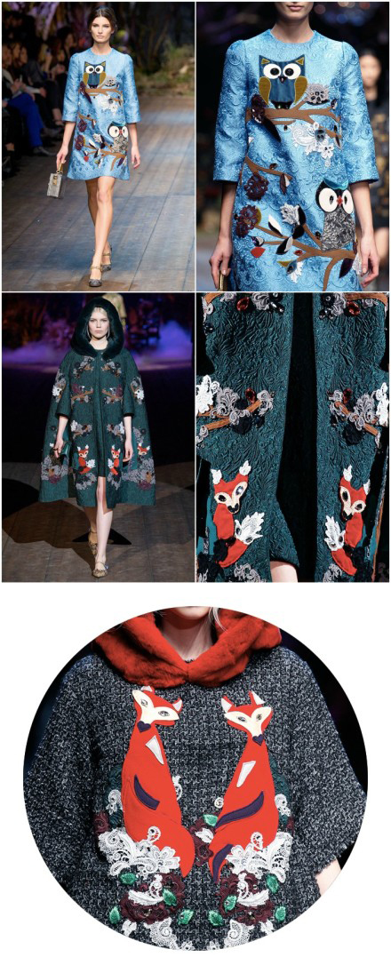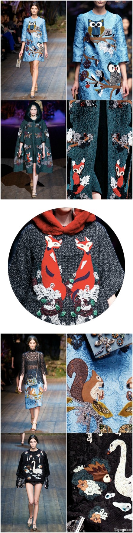 Dolce & Gabbana 2014秋冬系列给我们讲了一个华丽丽的童话故事:冬天的森林里,小红帽穿着雪纺花裙,小动物们欢聚一堂,到处都是开宝盒的金钥匙,女骑士头戴镶满宝石的锁子甲。