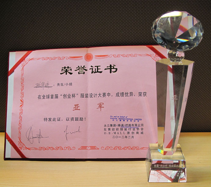 原创商城全球首届 “创业杯”服装设计大赛,是由永立集团(香港)控股有限公司、东莞纺织服装行业协会共同主办,O.B.MALL原创商城承办。为了帮助选手寻找到自己的未来发展之路,并为他们提供一个展示原创设计的平台,推动设计师自主服装品牌建设和创业发展。同时也为学生实习,实训,就业提供更大空间。 该大赛经历了几个月的忙碌,2010级张华进学生在我院领导、服装设计教研室吴佳耕、杨云等老师的组织帮助下,从初稿设计的筛选,到正稿的评审,成衣的生产制作,最终以优异的成果,在总决赛中获得了亚军。 |