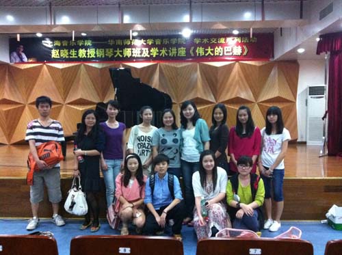 黄雅说:“下午的钢琴大师班,赵晓生老师的激情让我感到他和其他的大腕教授的不同,没有架子,和蔼可亲,他指导第一个同学演奏了《皮黄》,当同学弹完后,赵晓生老师问了几个问题,一开始我完全听不懂,到后来,赵晓生老师用生动的语言和动作来解释东西方音乐,我突然感觉,钢琴是那么的有生命,好像每一个音都有一个故事。第三个同学演奏的《葬礼进行曲》,一开始我并不不知道弹的是什么,在赵晓生老师的指引下,才知道原来是一首来自肖邦写的埋葬爱情的曲子,每一小段都有一个对话,再重新听,会发觉,这首曲子是有情景的,到晚上去听赵晓生老师的独奏会,我从来都没有那么认真的坐在那里听,好像每个音都害怕错过,我印象最深的就是那首《琴韵》,他把中国的民族乐器带到钢琴上,用钢琴演奏出来,在《琴韵》这个曲目上,我有一点感觉,赵晓生老师太高的技艺和对作品本身的解读,我感受不到,我只是有一点感觉,听赵晓生老师的钢琴大师班和个人钢琴独奏会,很荣幸。