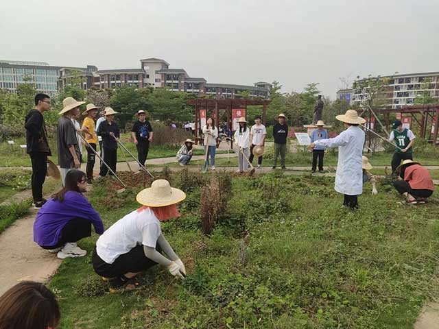 ▲学生们认真学习翻土和除草等劳动技巧