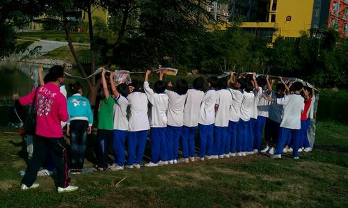 此次活动是以增进同学间合作与互信,同时帮助他们放松身心以更好的状态迎接明年中考为目的的,因此培训全程采用趣味游戏的方式进行。活动共含三个项目:“解码”、“珠行万里”和“履带车”。随着培训的不断深入,项目难度逐渐增加,同学们积极性也逐渐提高,看似简单的游戏却需要同学们有很好的思维判断能力和团队协作意识,最终,“履带车”项目的PK环节使本次培训达到了高潮,各团队内部的沟通效果和合作能力得到了充分的考验和体现。经过同学们的积极努力奋斗,最终“广告排队”出色地完成了自制履带绕湖心岛一圈的挑战任务,夺得了本次活动的胜利。
