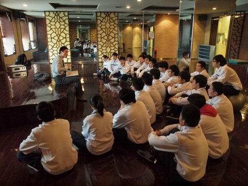 在3000多平方米的会所中,唐经理先是带大家依次参观了前台、水吧、会员休息区、有氧器械区、力量训练器械区、有氧操房、瑜珈房、动感单车房、拳击台、普拉提房和体能评估室等一系列专业健身区域及设施,并详细讲解了各区域所授课程及教练配备。之后,在高温瑜伽房,唐经理开始了第二阶段的授课——健身教练(私人教练)人才培养及俱乐部岗位需求分析。
