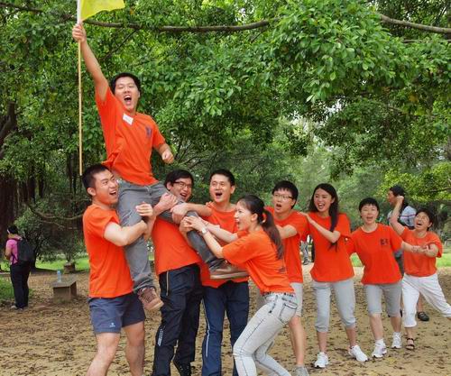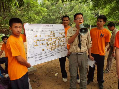 上午的培训,在一系列集中注意力的游戏中开始了,首先是拍掌游戏和拍颜色游戏,在游戏进行中,学员们都非常的投入和积极,达到了很好的效果。第二项是团队组建,将学员分成四组,展示团队风采并阐明建队思路。接下来就是团队合作的游戏,“亲密一刻”、“水中捞月”、“鼓舞飞扬”等一系列的团队合作游戏中,学员们的团队协作能力和团队精神得到了考验和提升。在上午培训进行当中苏张龙、罗祥琪、叶志辉和梁嘉进同学花了整个上午的时间将下午将进行的定向越野项目的点标全部定好。