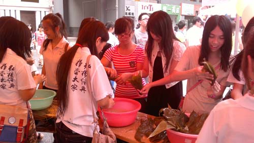 粽子包起来了,来来往往的学生停下脚步亲手感受包粽子的乐趣;