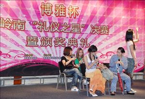 2009年6月4日下午2时30分,由博雅教育学院语文教研室组织的“博雅杯礼仪之星”大赛决赛顺利拉开序幕,本次比赛的流程包括仪容仪表、比我介绍、才艺表演、知识问答和礼仪景情表演五个环节。参赛选手美丽、自信、大方,向评委和观众展示了自己的才艺:钢琴独奏、诗歌朗诵、茶艺、古筝,让观众宁静而又陶醉;欢快的新疆舞蹈、充满异国风情的印度肚皮舞,让观众感受着舞者的风采;魔术表演更是吸引了我们大家的眼球,俏皮的手指灯以及变色的俏纸扇,使在场的每一位观众无不大开眼界,最后,比赛在掌声与鲜花中落幕,活动圆满成功!(图、文/朱青)