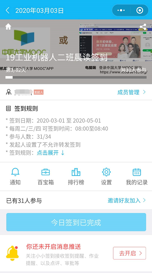 辅导员、班级导读员紧密有序组织,做好传达学习通知及考勤工作,同学们准时在小程序或者微信上“打卡”。