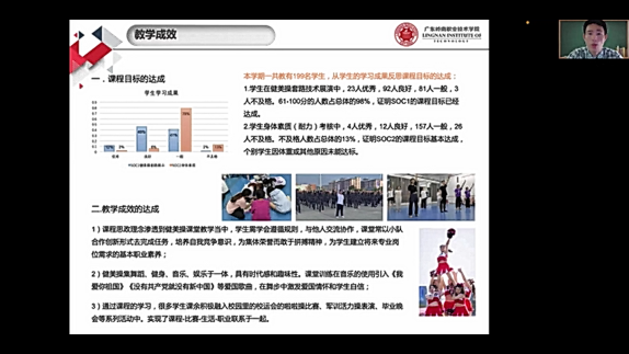 荆宏侠老师则通过校园活动项目单元中的“活动方案”写作,细致地讲解这部分的教学设计。课前的预习,微课的发布,让学生课前就对这部分内容有初步的认识。课堂40分钟的内容,结合社会热点导入课程,引起学生的兴趣。通过互动、讨论、案例分析、写作练习等方式让学生理解活动方案写作的结构和写作要点。课后作业通过学生自评、小组互评、教师综合考量的多元评价方式,全面考核学生的成绩。荆老师用数据和图片展示了学生的作业成果和成绩分布。