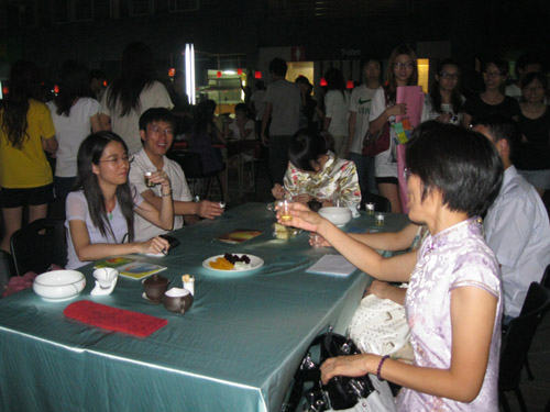 夜幕降临,活动开始,烛光点点,更让现场充满了中秋节日的气氛。场地的中央,设有几处雅致的桌椅,供大家品茶、吃月饼、赏月、谈心,每一桌都有一名茶协会的茶艺师为大家展示茶艺。