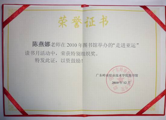 ,由岭南职业技术学院图书馆主办的“走进亚运”读书月活动顺利落下帷幕。我院陈燕娜老师为本次活动作出了突出贡献,被授予特别组织奖,博雅教育