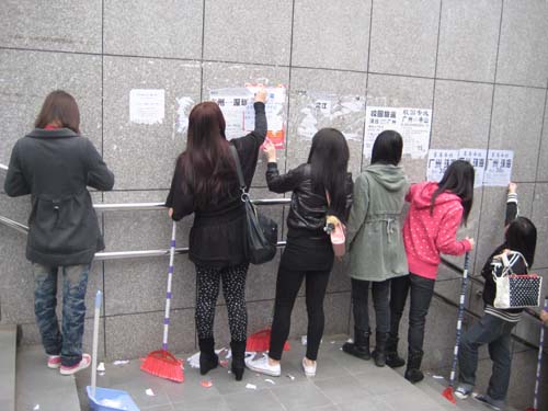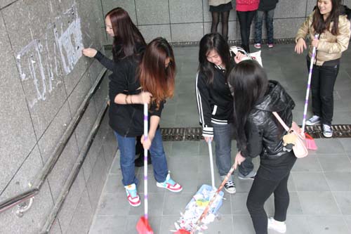 2011年3月24日下午,09、10音乐表演班同学在东、南区之间的隧道针对于隧道“牛皮癣”展开了“春风三月学雷锋、志愿服务再推进”的义工服务。