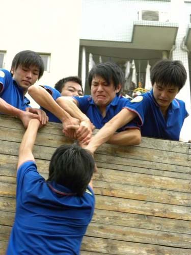 下午1:50,更艰巨的任务接踵而来。首先是 “解手链”的活动,将8小组分成了4大组,20多人把手交叉握着并最后得解开成圆圈,看似简单,但有些队员的手却纠缠在一起。接下来的“南水北调”很能体现一个团队的合作精神,一轮下来,桶里的水没多少,洒在路上的水却是一滩又一滩的。最后也是最关键的一个环节:翻越毕业墙。一面