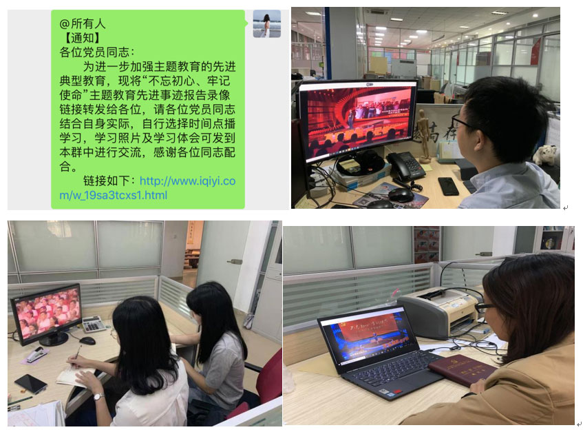 2019年10月30日,我支部对主题教育活动进行线上线下部署,要求支部全体教师党员采取个人自学、集中研讨等方式学习“不忘初心、牢记使命”典型先进案例,党员们认真观看先进典型事迹,群里积极发表观点。