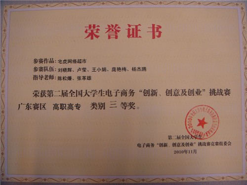 2010年11月20日由管理学院选送的《宅虎网络超市》(参赛团队成员:刘晓辉、卢莹、王小娟、庞艳梅、杨杰腾,指导老师:陈松燔、张革雄)参赛作品,参加由教育部高等学校电子商务专业教学指导委员会面向全国高校(含港澳台地区)举办,教育部、财政部“高等学校本科教学质量与教学改革工程”重点支持项目-——全国大学生电子商务“创新、创意及创业”挑战赛。