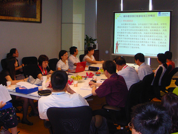 管院在本次检查工作汇报分为两大部分,第一部分为易丹华院长助理作国学早读、教学信息、学生考证、08级学生毕业论文等期中教学例行检查各项工作情况汇报;第二部分由李旭穗院长针对于我院本学期师资引进和培养,校企合作、教风和学风建设等工作及发展状况进行汇报,同时也提出了主要影响教学质量升温的因素与思考。