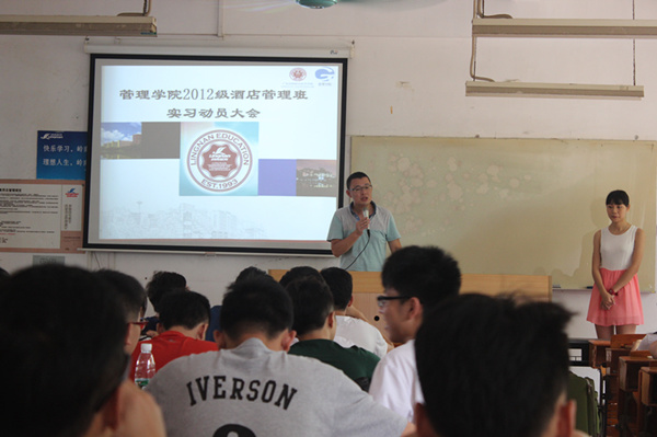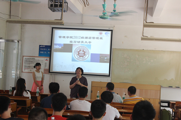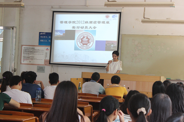 2014年9月2日下午14:00,管理学院2012级酒店管理班实习动员大会在一教1204隆重召开!出席本次动员大会的有管理学院敖利玲院长、管理学院易丹华副院长、旅游酒店教研室主任许宝利老师、旅游酒店教研室胡卫红老师、12级酒店管理班辅导员黄琪老师及12级酒店管理1、2班的全体同学。
