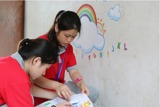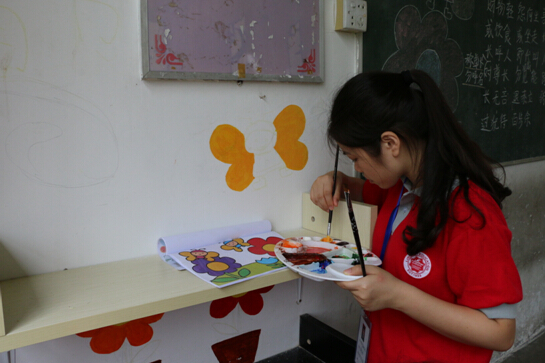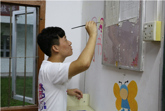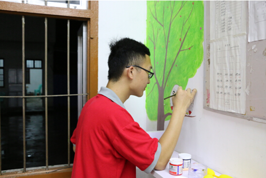 三下乡进行到第四天,花绘组美化校园的工作仍然在火热进行,因为要装饰的课室有孩子们在上课,所以他们先在纸上认真构好图。
