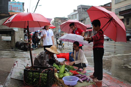 早上六时三十分,后勤组三位外出成员出去购买食材的时候,雨却越下越大。他们撑着雨伞前往前往附近的菜市场,除了购买食材还需要与菜贩讨价节约成本。因为去采购的人数较少,而购买的食材份量需要供应近50人的食用。后勤组的志愿者需要一手撑着伞,一手提着十