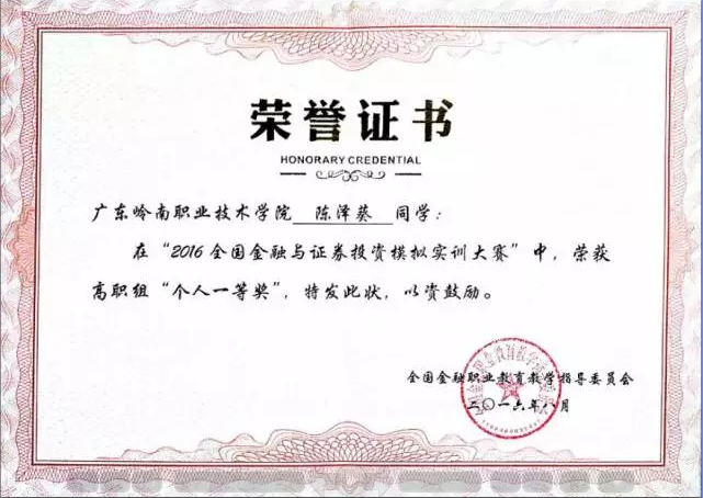 我校经管学院投资与理财专业共派出两支队伍参赛,每队十人,由经管学院的张锦莉、黄辰老师进行指导。经过两个多月的激烈角逐,来自我校14投资与理财1班的“岭南一队”获得团体三等奖。来自14投资与理财2班的周湛坤获得个人三等奖。来自14投资与理财1班的陈泽葵竞赛成绩优秀,在1550名参赛学生中排名第8,荣获个人一等奖,这也是我校学生参加证券类大赛目前所取得的最好成绩。