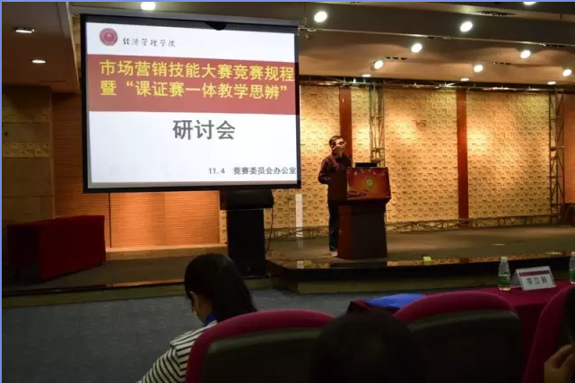 广东科学技术职业学院严中华教授队对将于12月4日在我校举行的大赛进行赛项规程解读。随后,经济管理学院何静院长进行赛事说明,发布赛项官方微信公众号。来自山东商业职业技术学院工商管理学院院长、全国市场营销技能大赛国赛专家组成员王鑫教授就“课证赛一体的教学思辨”进行了为时一个半小时经验分享并与与会的院校代表进行研讨。