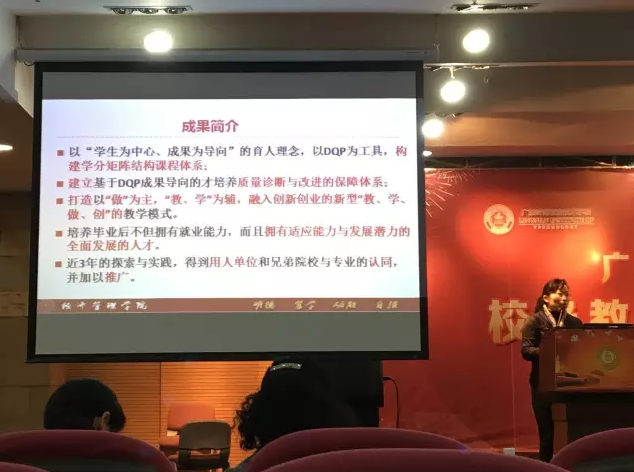 首先,由翟树芹老师代表‘基于DQP成果为导向的工商企业管理专业人才培养模式探索与实践’教学成果团队向各位评委和全院教师做了详细的汇报,展示了工商企业管理专业在基于DQP框架成果导向的学分制改革背景下做的探索与实践及取得的成效,赢得了各评委的认可。
