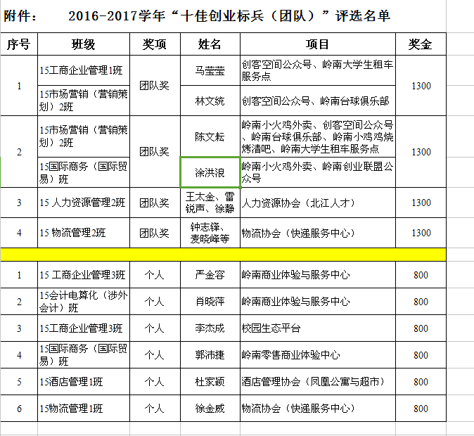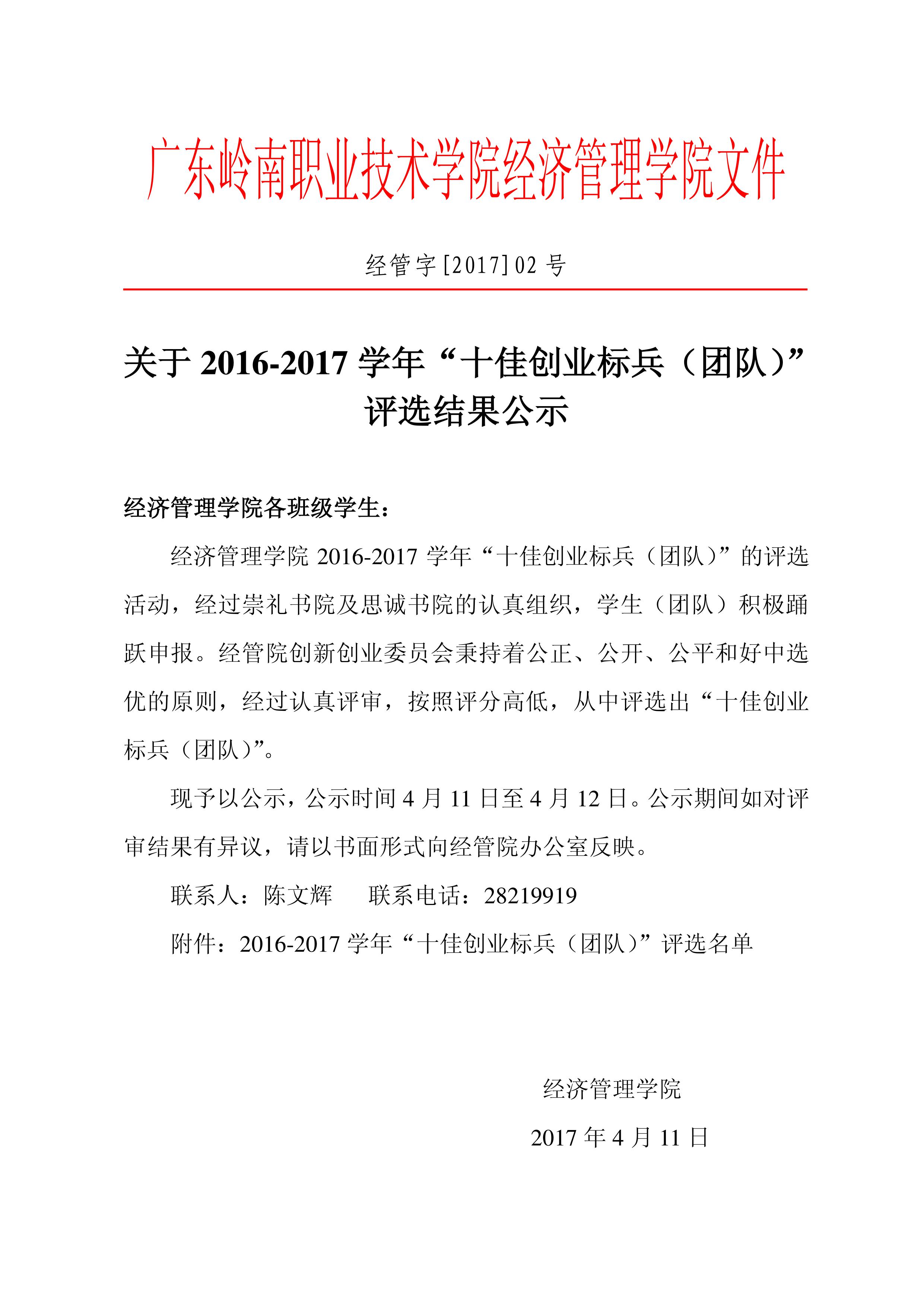 关于2016-2017学年“十佳创业标兵(团队)”评选结果公示