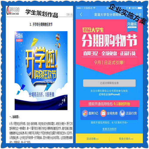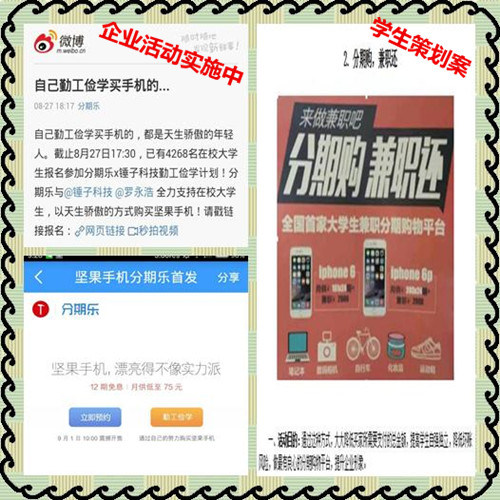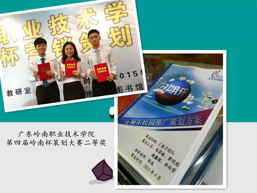 我院市场营销专业学生“C原子团队”所策划的《分期乐校园推广营销策划方案》在2015年6月举办的广东岭南职业技术学院第四届岭南杯策划大赛中荣获二等奖的优异成绩,随后该作品被深圳分期乐科技有限公司采纳,并在2015年9月1号通过有商业价值的商业活动实施此方案。