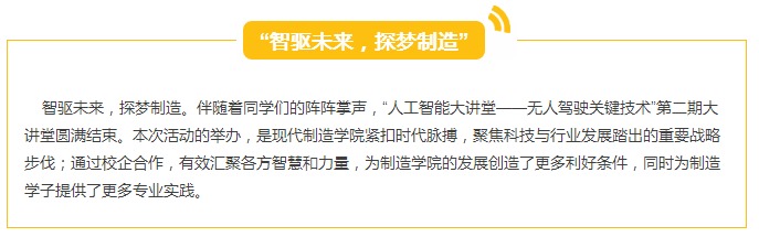 最后,田晶院长作总结讲话。田院长强调“无人驾驶”作为日后社会发展的一大趋势之一,有着可期的前景。希望制造学子秉承敢想敢做的态度,主动补充“智能制造”专业方面的积累,并积极投入到专业学习和实践中,争做时代弄潮儿!田院长的发言让同学们备受激励,赢得同学们的阵阵掌声。