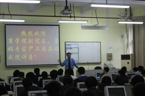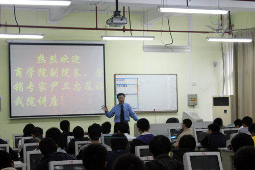 讲座在岭南科技中心二楼机房举行,现场早已座无虚席。尹卫忠首先讲述他营销经历中失败的两个案例,让大家知道“营销和我们的想象是有距离的”。然后把他十几年点滴积累的营销智慧与在场同学分享,意在让更多的人认识什么是营销,如何去销售。