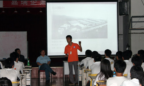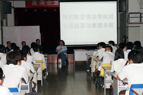 最后学生们认真听取了嘉瑞集团行政副总经理余慧珊的讲话和黄继泳参加工作后的体会。“公司录用员工的标准有哪些呢?”一位在座的学生提出问题。余总意味深长地用 P(个人素质)+ASK(态度、技能、知识)+T(时间管理)+“识做”回答了同学的提问,并且详细地解说了其中的奥妙。余总幽默风趣的讲解让在场同学获益不浅。