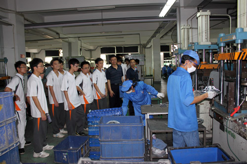 在参观学习之前,首先由制造学院毕业生,现任嘉瑞企业学院主管的黄继泳为同学们详细介绍了公司的概况、公司的企业文化。会后,同学们来到了员工饭堂与公司领导一起就餐,期间不时传来笑声,气氛十分融洽。下午,在黄继泳积极组织下,大家参观了工厂的二次加工、装配组、喷油组等。同学们积极认真,踊跃在各车间观看工作人员如何制造产品,近距离接触公司生产的压铸产品,与车间工人进行互动交流,将课本理论学习与实践相结合,解决了一些学习过程中遇到的问题,对自己将来可能从事的行业有了更好的直接认识,圆满地完成了本次参观。