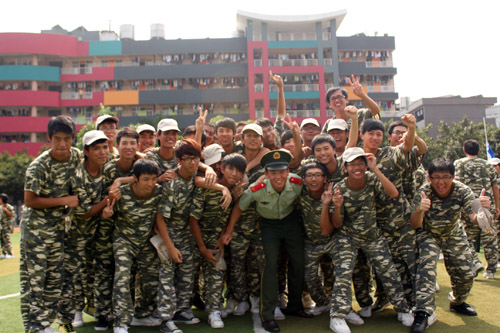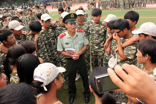 有的学生迅速找到了自己的教官,献上礼物后,敬一个标准的军礼;有的教官在人堆中被男同学高高地抛起;有的学生艰难地挤进人群里,去接近自己的教官;也有些学生,用相机或者是手机,掂着脚尖,照下教官的样子,照下教官的背影,照下这离别的难忘一刻。