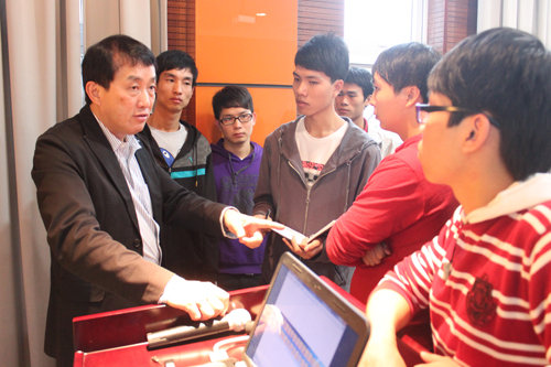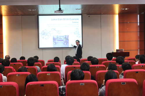 郑教授和学院教师们除了带领三年级学生开发便携式自行车的项目,还亲自带领六座电动车毕业设计学生团队。电动车项目参与者也包括10级工业班有兴趣的同学们,让他们一起进行产品的外形设计。通过这个项目的实施,毕业班的同学们把电动车项目作为自己的毕业设计项目,增强自身的就业竞争力。设计团队的最终目标是在岭南的校园中能有学生亲手设计的电动车载人穿梭。大会中,同学们积极提问发言,与郑教授面对面地做交流,大家对项目都非常感兴趣,特别是看到郑教授演示的各种震撼的国外电动车范例,同学们都着迷了。
