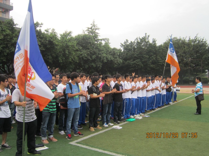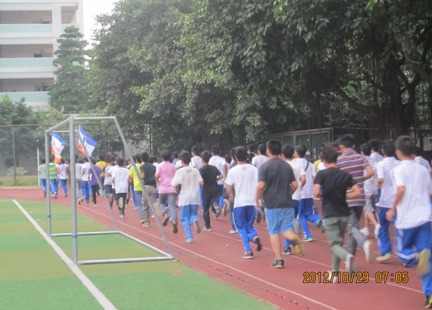6点50分,足球场上学院的旗帜在风中飘扬着,学生们紧随其后。欢快的步伐,爽朗的微笑,充分体现出新气象,新风貌。