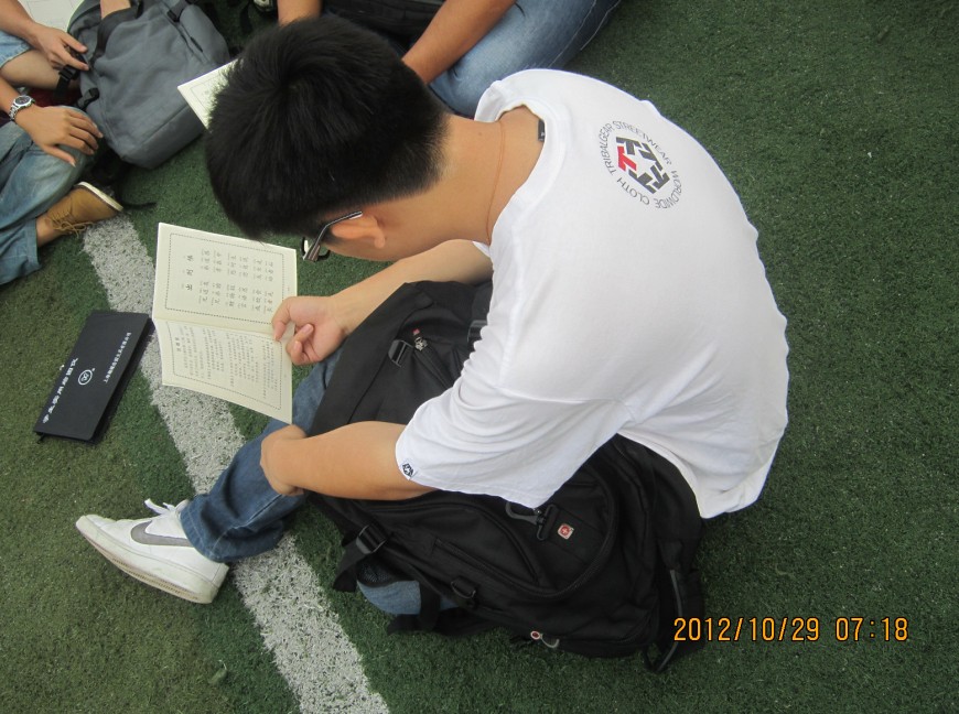 足球场上朗朗读书声,声声入耳,新生心里的热情通过读书声热烈散发出来,展现出新生的活力四射。12级新生辅导员张保磊老师带领大家学习了健身操,让大家在忙碌的学习之余也能够更好的照顾自己的身体。