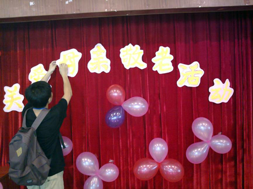 14点30分,同学们以分组的形式展开了本次义工活动。第一组,负责清洁老人休闲的走廊,经过了前两天暴雨的天气,走廊上污泥堆积,廊杆上也是污泥斑斑。闷热的天气,丝毫抵挡不住同学们的热情,鼓足劲为老人清洗一片休闲的地方。第二组,帮助布置老人活动场所,9号就是母亲节了,老人公寓内举行了“关爱母亲敬老活动”,为了能让老人能过一个开心的节日,同学们都很用心地装饰着场地,希望借着“母亲节”向老人公寓的老人致上最真诚的问候。第三组,与老人公寓的爷爷奶奶谈心,倾听老人的心声,通过谈心也使得09级的学生零距离感受到了老一辈人们对当代大学生的期望。