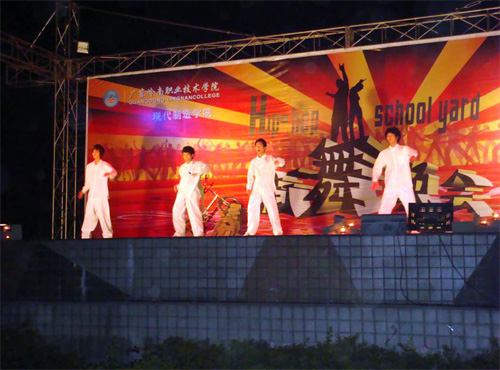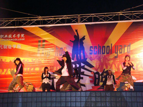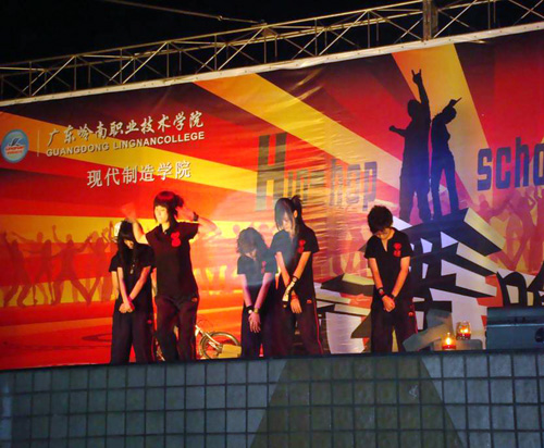 2007年11月22日星期四晚7:30,现代制造学院团总支学生会于东校区大舞台举行了HipHop School Yard 街舞晚会,此次活动的宗旨在集合邻近高校街舞爱好者,在岭南的大舞台上通过表演比赛来交流舞技,展示街舞的文化。
