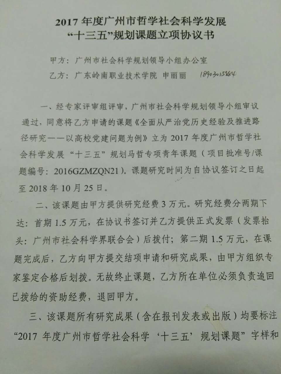 经过广州市社会科学规划领导小组专家评审组评审,思政部申丽丽老师申请的题为《全面从严治党历史经验及推进路径研究——以高校党建问题为例》课题被立为2017年度广州市哲学社会科学发展“十三五”规划马哲专项青年课题。