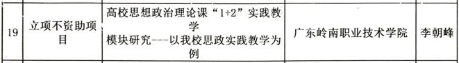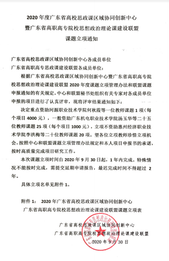 近日,广东省高校思政课区域协同创新中心暨广东省高职高专院校思想政治理论课建设联盟公布了2020年度思政联盟课题立项结果。其中,我校马克思主义学院李朝峰主任申请的课题《高校思想政治理论课“1+2”实践教学模块研究-一以我校思政实践教学为例》成功立项!