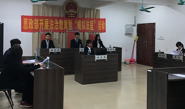 为了贯彻落实十九大报告中关于全面依法治国的理念精神,思政部于2018年举办了法治教育暨"模拟法庭"活动。