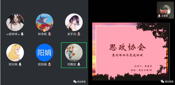 2020年6月14日,思政协会迎来了一年一度的换届竞选,遗憾的是因为疫情我们只能采取线上的方式进行选举。本次选举在腾讯会议举行,由18届的干部组织并面试,指导老师欧阳娟全程参与指导。经过这些竞选者精彩的演讲和18届干部们的热情“刁难”,最后在指导老师和18届干部的商讨下确定了新一届干部的人选。新干部的名单的分别为会长许锦鹏、副会长兼秘书部长郑霞如、策划部长张春霞、宣传部长庄泽安、后勤部长吴佳鑫。