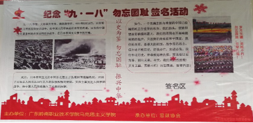 2020年9月18日,为纪念“九一八”事变爆发89周年,进一步弘扬爱国主义精神,引导师生铭记历史、珍爱和平和培养广大青年的历史责任感和使命感,激发大学生为实现中华民族伟大复兴的共同理想而奋斗的热情,思政协会于9月18日至20日,在博雅楼风雨长廊举行纪念“ 九·一八 ” 勿忘国耻签名活动。
