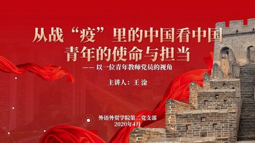 外语外贸学院第二党支部书记王淦同志以《从战“疫”里的中国看中国青年的使命与担当——以一位青年教师党员的视角》为主题,带领支部全体党员深入学习习近平总书记关于疫情防控工作的系列重要讲话和指示批示精神、习近平总书记给北京大学援鄂医疗队全体“90后”党员的回信精神,分别从:一、战“疫”充分彰显中国特色社会主义制度的优越性;二、战“疫”是展示我国治理体系和治理能力的一次生动实践;三、深刻领会中国共产党驾驭复杂局面,应对风险挑战的强大能力;四、深刻领会中国共产党坚持以人民为中心的发展思想;五、爱国担当的“生力军”——战“疫”充分展现了中国青年的使命与担当。引导全体党员深刻领会党的集中统一领导是中国特色社会主义制度的最大优势,要求党员同志进一步增强“两个维护”的自觉性和坚定性。通过介绍疫情面前全国上下的空前团结和众志成城、在抗疫斗争中展现出的强大组织动员能力、我们党始终把人民群众生命安全和身体健康放在第一位的责任担当,引导全体党员深刻领会“全国一盘棋”、“调动各方面积极性、集中力量办大事”、“坚持以人民为中心的发展思想,不断保障和改善民生、增进人民福祉”的制度优势。