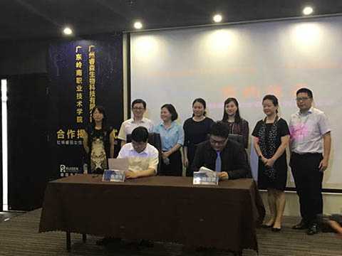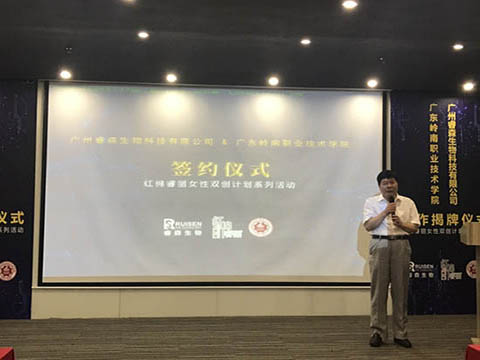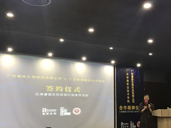 接着,广州市妇联的龚红副主席也表达了对本次签约仪式的支持和感谢,十分看好岭南和睿森的合作,希望日后双方的合作能更进一步。 11点许,在大家共同的期盼下,在各方领导的见证下,岭南学院陈思东副校长和睿森的高海波总裁正式签订了《广东岭南职业技术学院与睿森生物校企合作框架协议》。紧接着各方领导上台进行了本次仪式的剪彩环节和揭牌仪式,揭开了岭南学院和睿森的合作序幕,每个人的脸上都洋溢着喜悦之情。