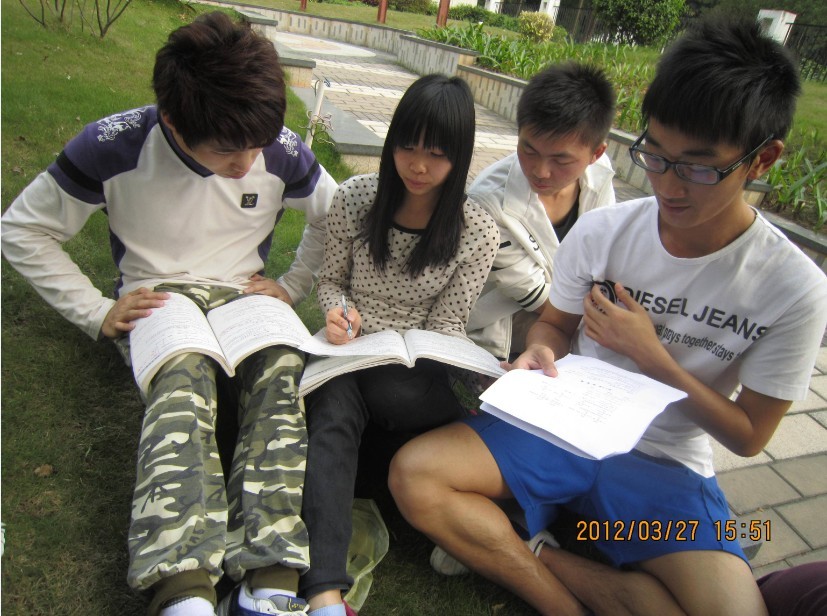 互帮互助小组在校园草地上学习