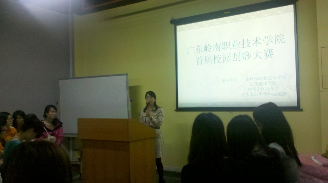为弘扬刮痧文化,普及刮痧知识,推广刮痧技能,提高广大学生的专业技能水平,由医药健康学院主办,中华中医药学会和北大未名生物科技集团协办的首届广东岭南职业技术学院校园刮痧大赛于4月18日在科技中心701A举行.医药健康学院院长杨凤琼﹑学务助理张朝登出席了本次比赛,此外,医药健康学院全体辅导员和将近60名学生参与了比赛;而比赛评委则由中华中医药学会的申志斌老师﹑刘金凤老师和刘莲芬老师担任。