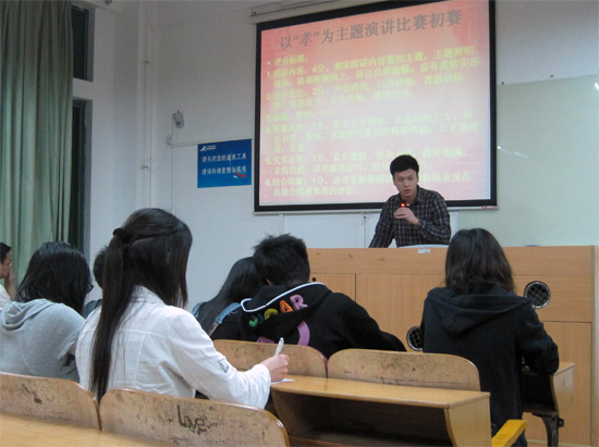 为进一步推广我院的国学教育,弘扬中华民族传统美德,激发同学们对父母、长辈们的孝顺之情,繁荣岭南的校园文化。我院于2010年4月18日在3309课室举办了以“孝”为主题的演讲比赛初赛。肖亚聪和许碧琴老师出席了本次比赛。